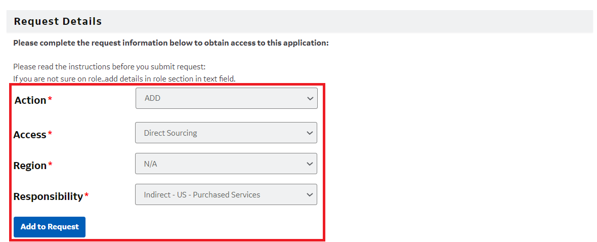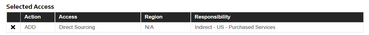 Click the Add to Request button. The role is now populated in the grid. To remove click the X.