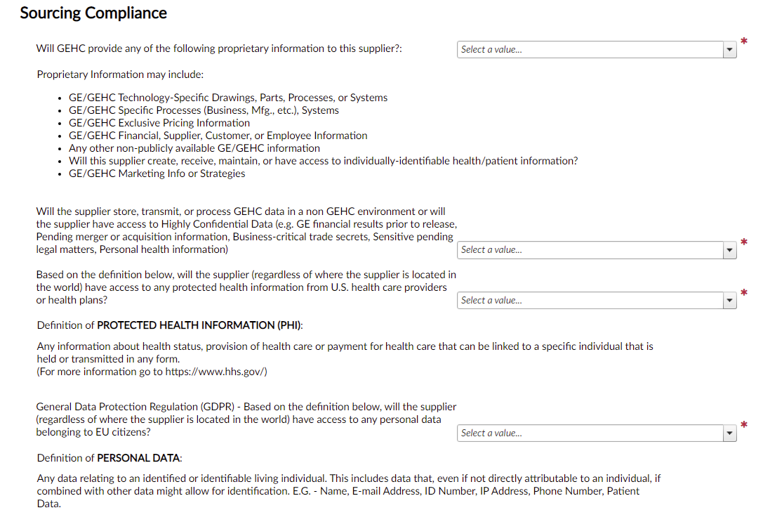 The Sourcing Compliance section includes a series of questions related to proprietary information, data storage, protected health information, personal data and GDPR.